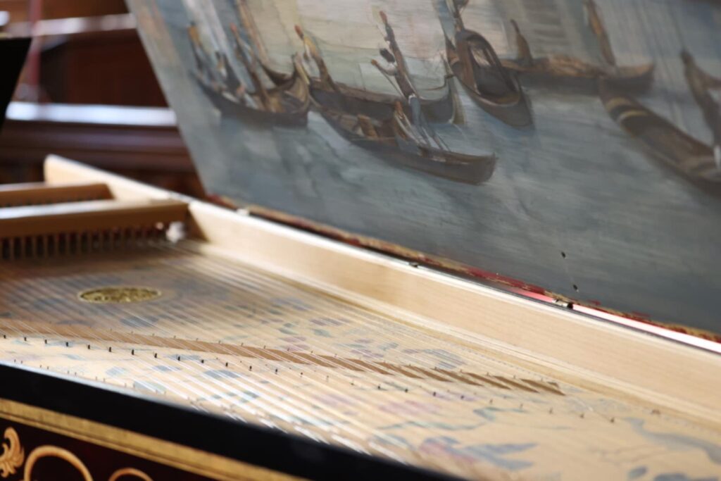 煌びやかな音色が特徴の2 段鍵盤チェンバロ。5 オクターヴの音域を持ち、バロックの幅広いレパートリーを演奏できます。屋根の絵画(ヴェネツィアの風景画・油絵)も美しく、演奏会を華やかに演出します。